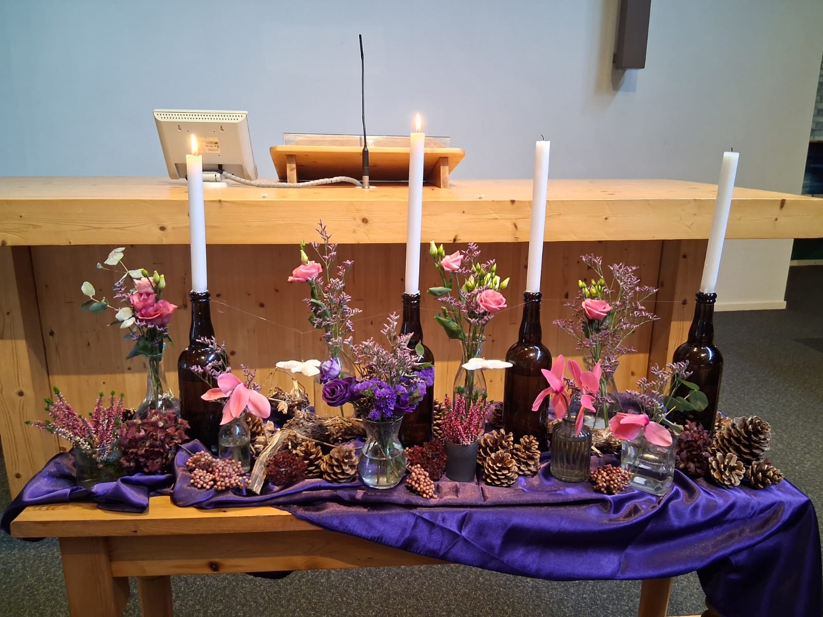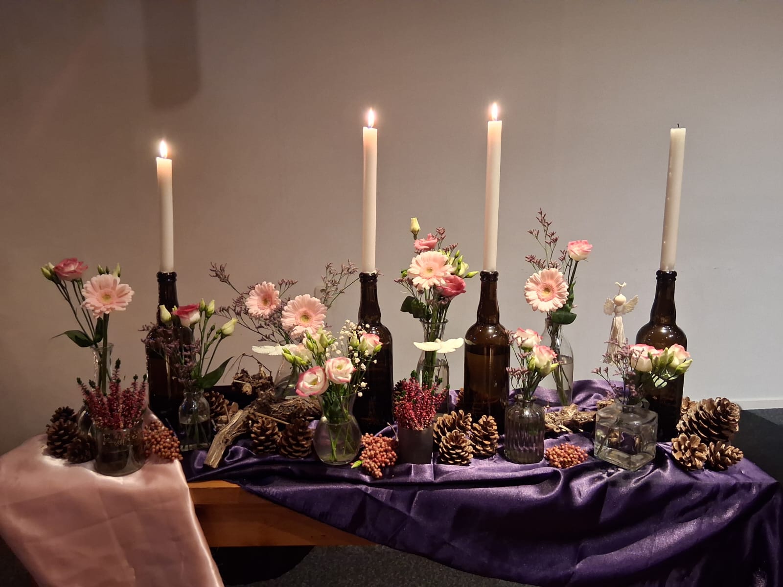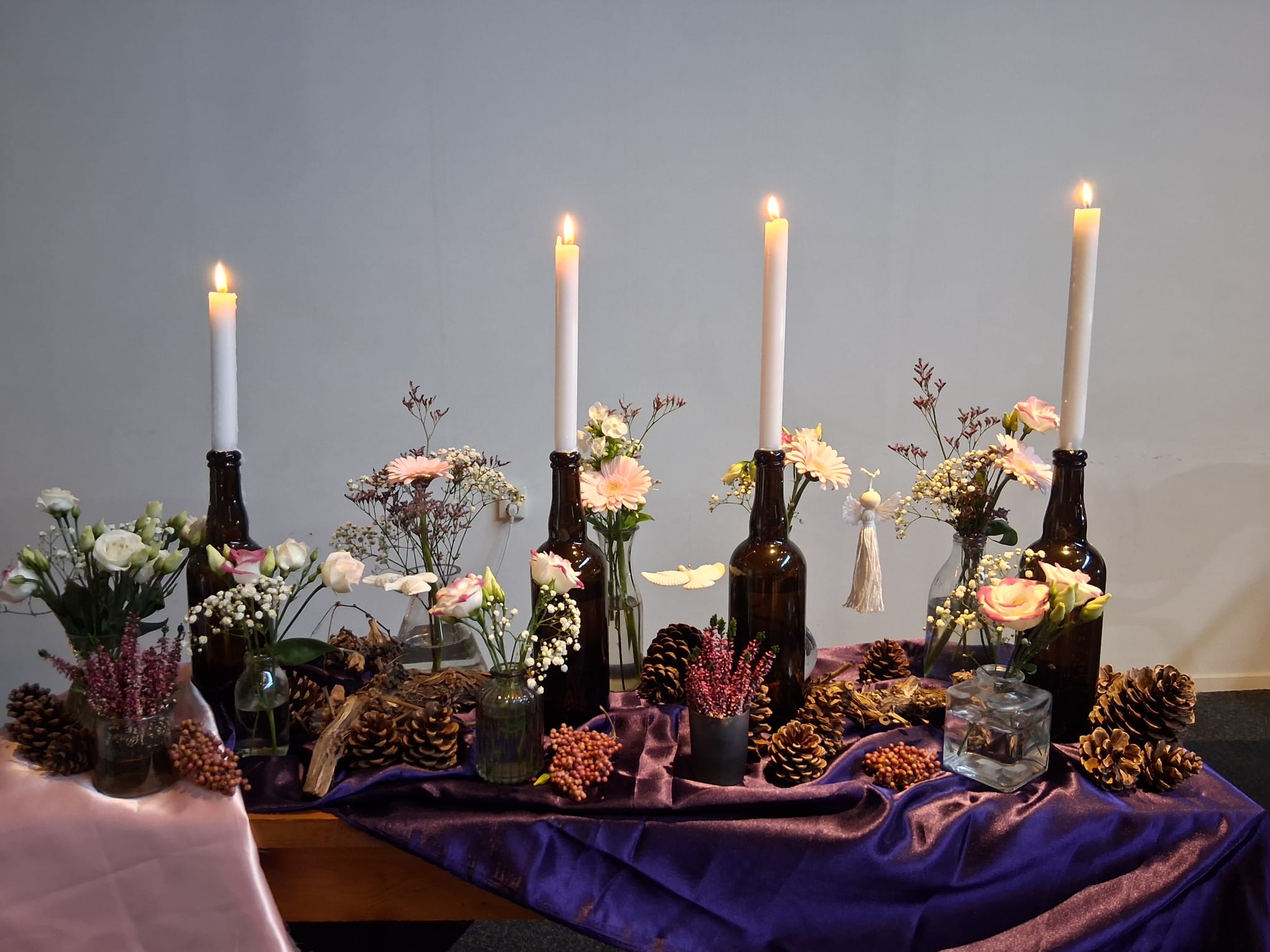 Van paars naar roze.Van stilte naar vreugde.De verwachting rijpt;4 kaarsen branden, de engelen zijn de dragers van de goede boodschap: het kind is onderweg.Het licht komt dichterbij.
