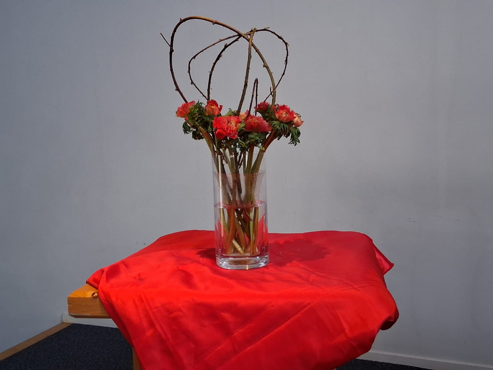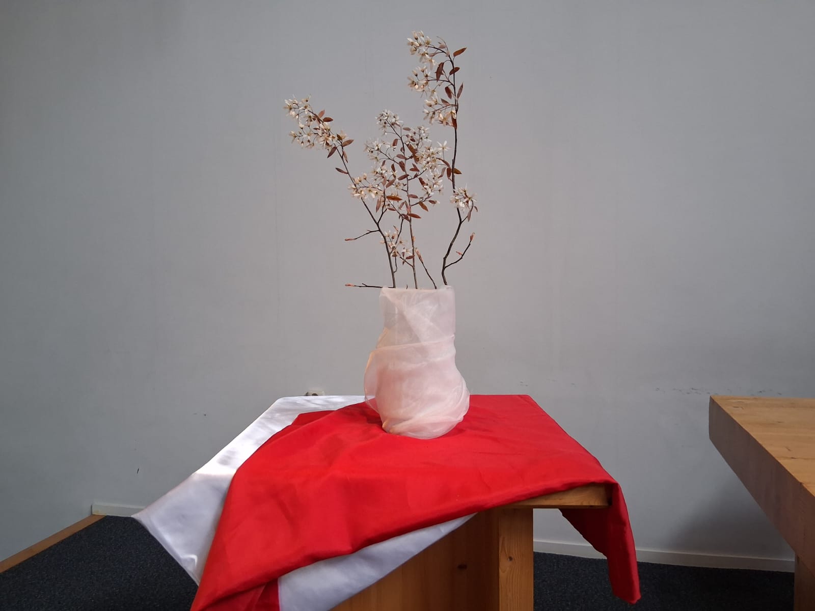 De tak met bloesem staat voor de zorg van het lichaam.Door de doek eromheen is het leven gevend water in de glazen vaas niet meer zichtbaar.Het is stil, in volle verwachting van beweging en een nieuw begin.
