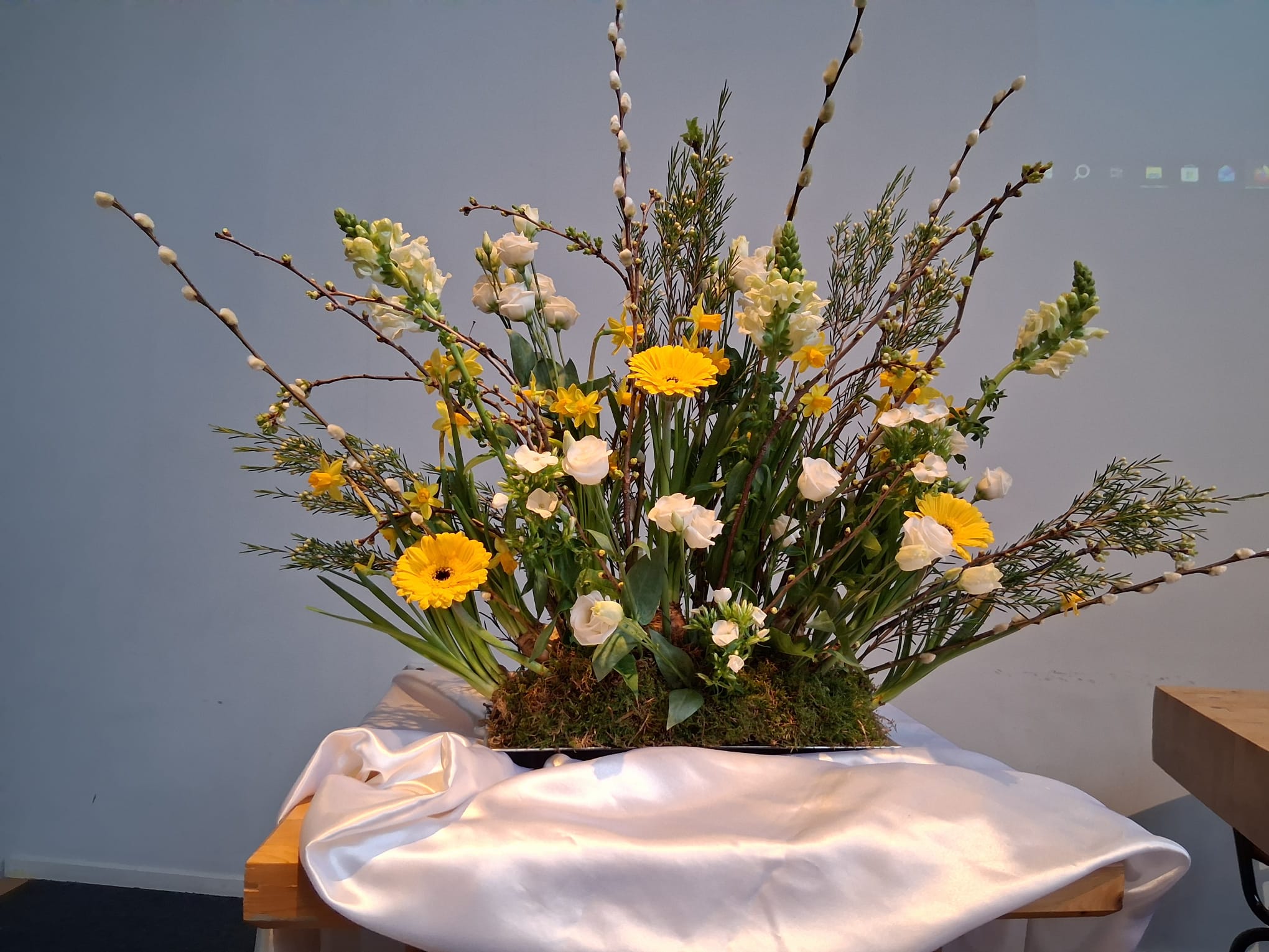 Een feestelijke schikking, met heel veel witte bloemen en gele accenten -misschien wel ‘trompet’-narcissen (!)Alsof – nadat het weken leek alsof er niets gebeurde – nu in één nacht alle bollen tegelijk zijn uitgekomen.Een bloeiende tuin vol bloemen van het begin.Een inspiratie om in beweging te komen en als mens ook tot volle bloei te komen in samenspel met ‘de ander’…